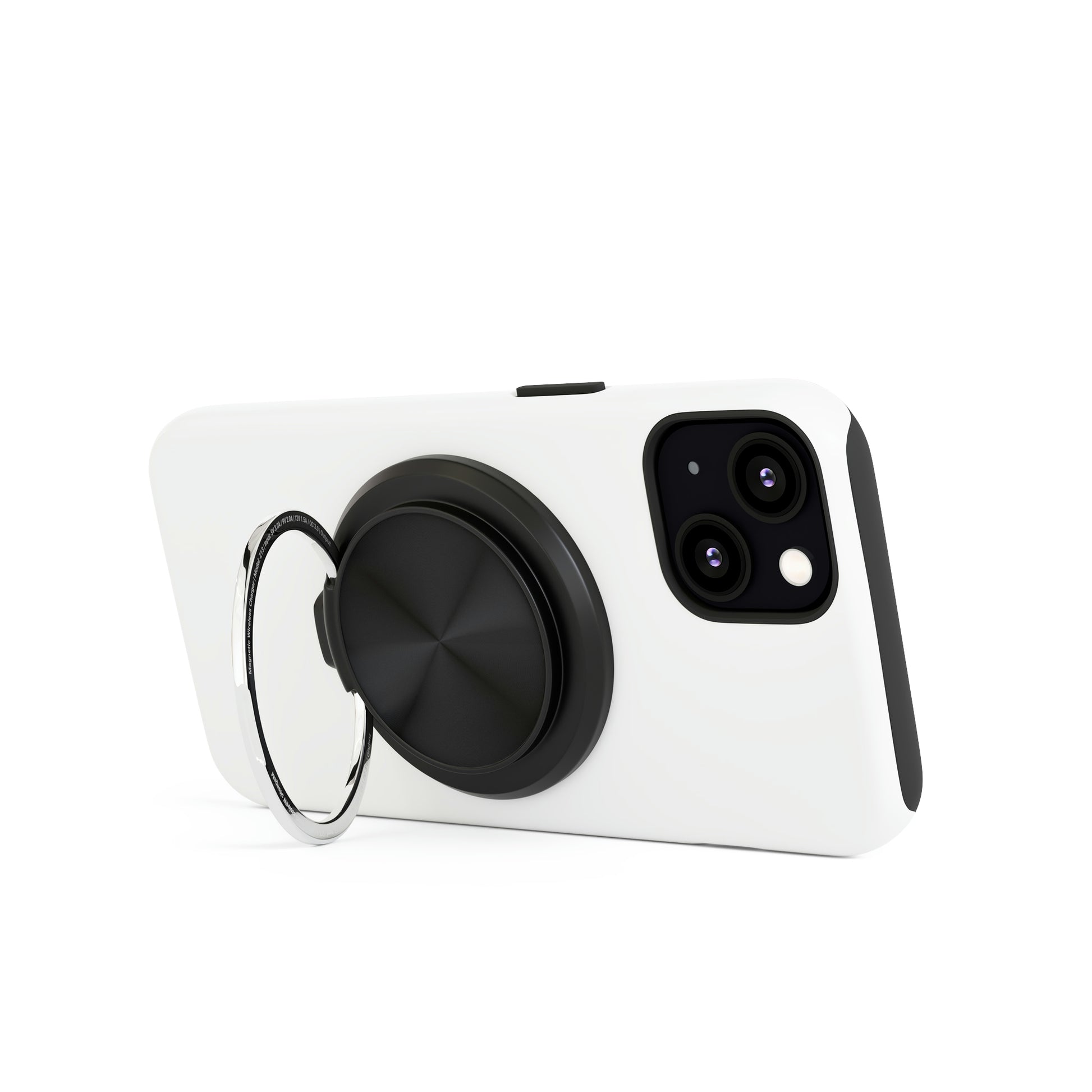Created to satisfy gadget fans around the world, this customized wireless charger works universally with all wireless charging-compatible smartphones. With a slick black body, a matte white top, and a silver metal ring, it's a perfect canvas for your art. Comes with a built-in ring holder, supports Qi wireless charging standard and MagSafe function, and ships with a USB-C cable included.